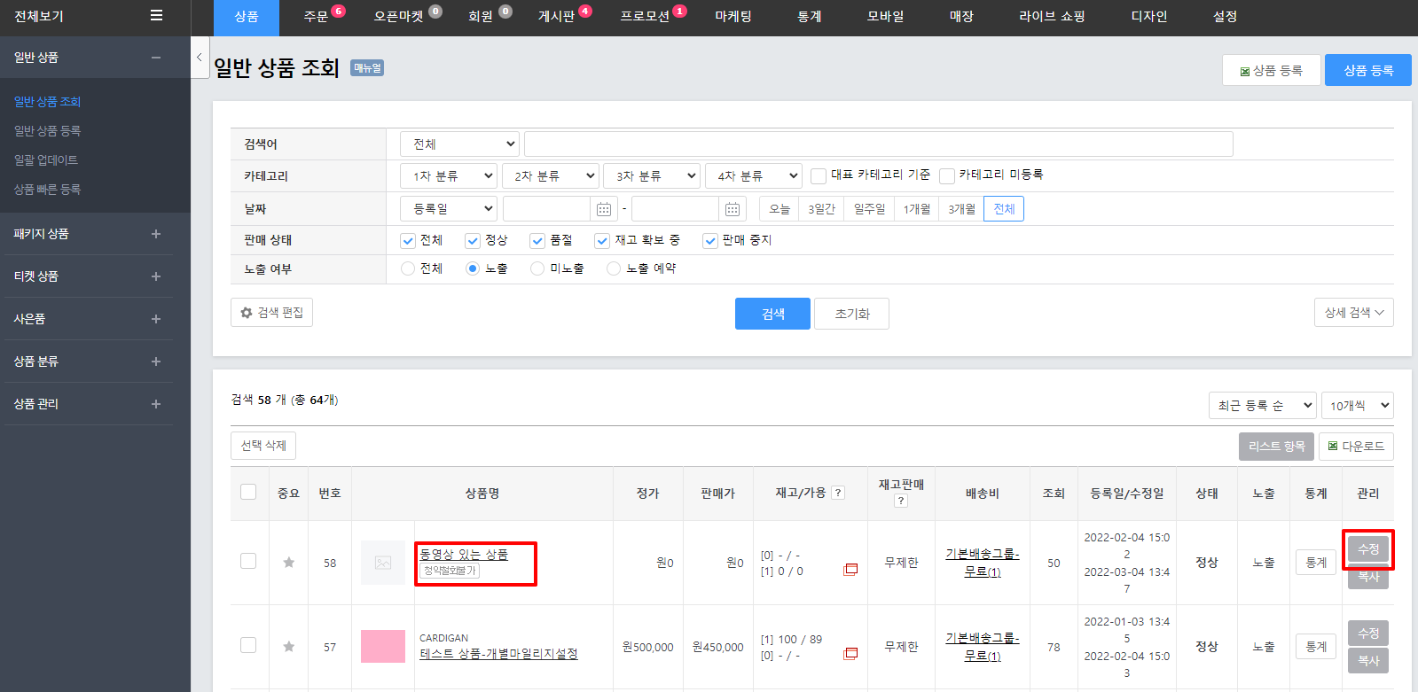 1. '상품 > 일반 상품 > 일반 상품 조회''에서 해당 상품의 '수정' 또는 '상품명'을 클릭합니다.