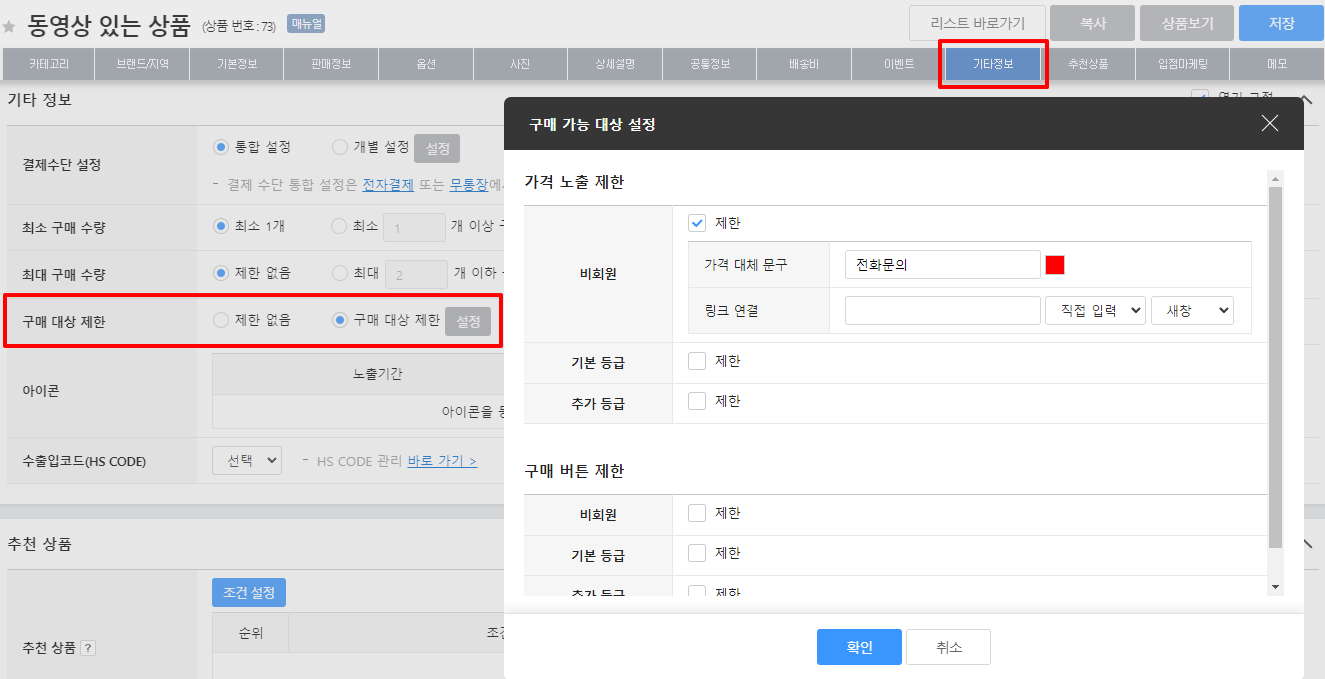 2. '기타정보 > 구매 대상 제한'에서 '설정'을 클릭한후, '가격 노출 제한' 또는 '구매 버튼 제한 설정'을 하시면 됩니다.