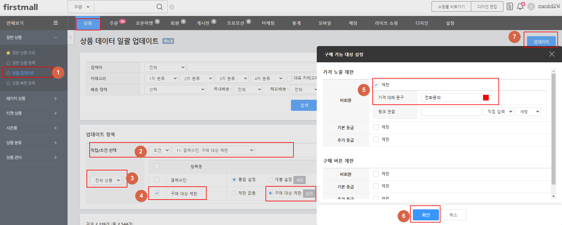 1. '업데이트항목>조건. 11결제수단,구매대상제한'선택