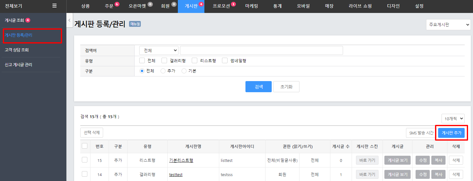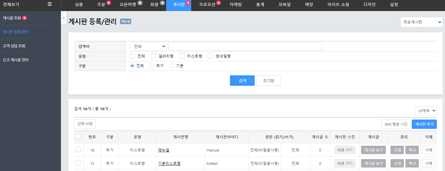 3. 게시판이 생성되면 '게시판 등록/관리'에서 확인할 수 있습니다.