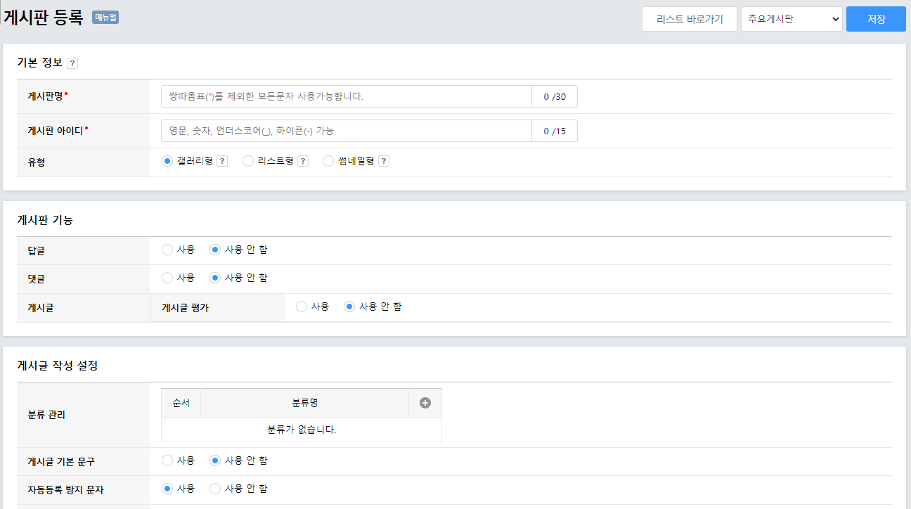 2. 생성할 게시판의 '기본 정보', '게시판 기능', '게시글 작성 설정' 등을 설정하여 게시판을 만들 수 있습니다.