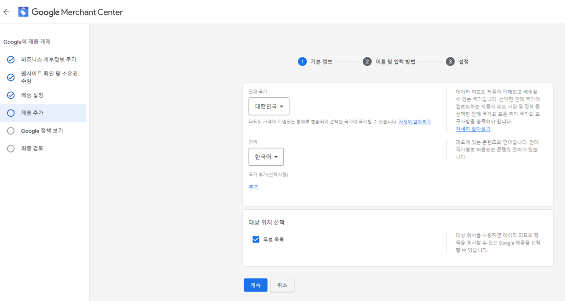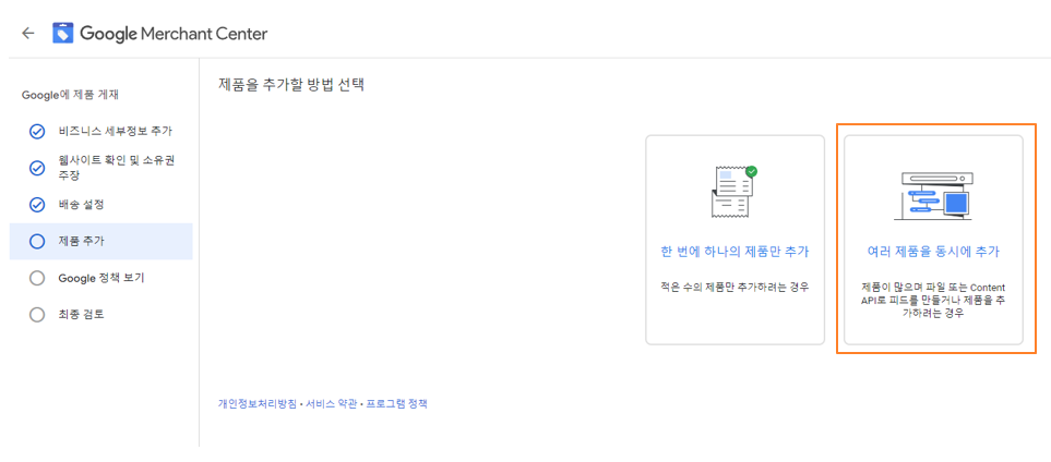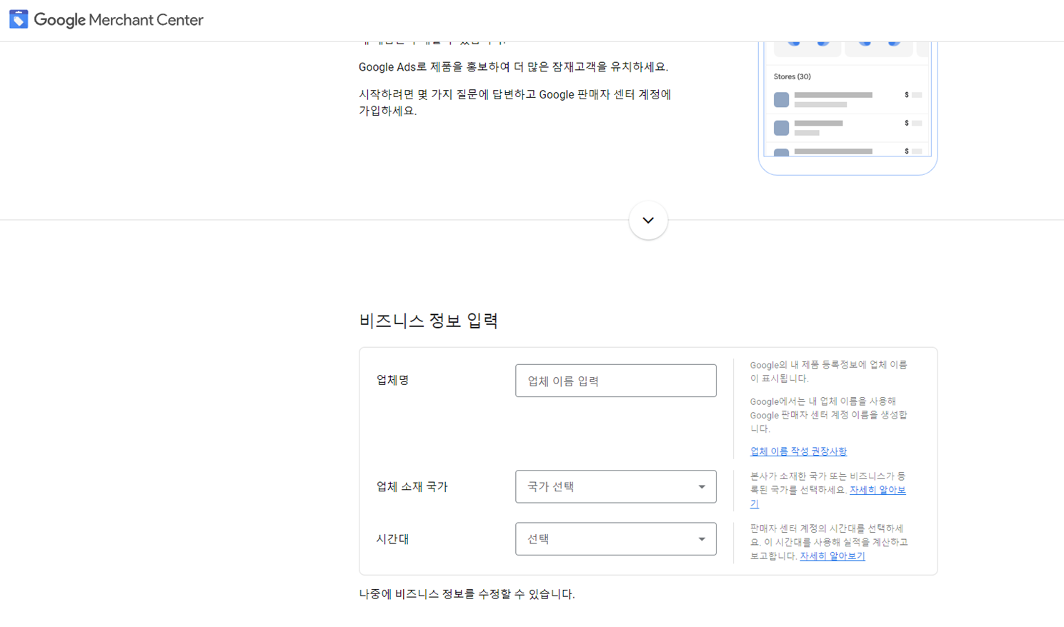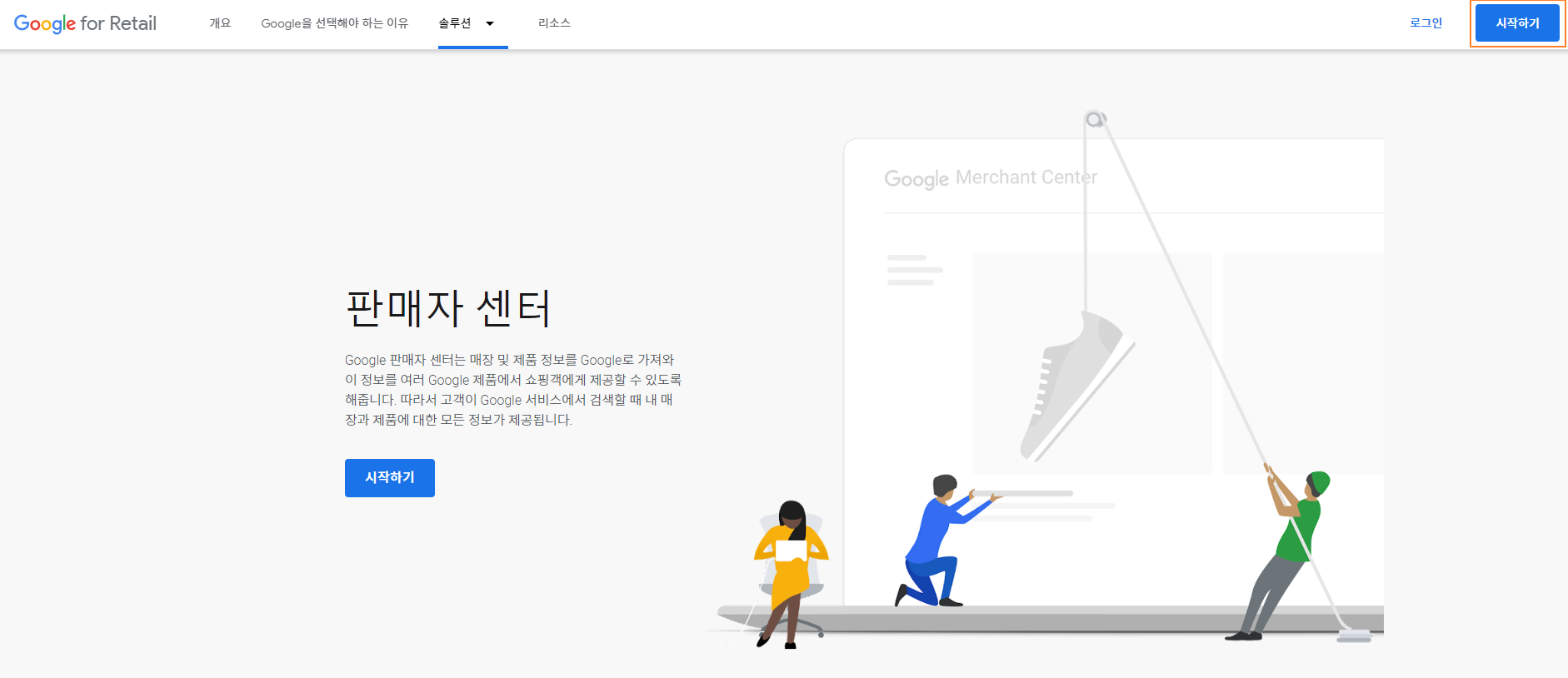 1. 구글 머천트 센터(판매자 센터)에 접속하여 로그인 후 '시작하기' 버튼을 클릭합니다.