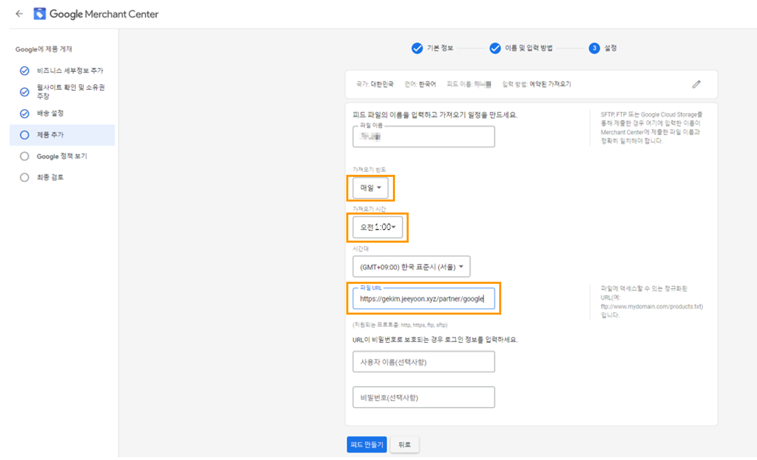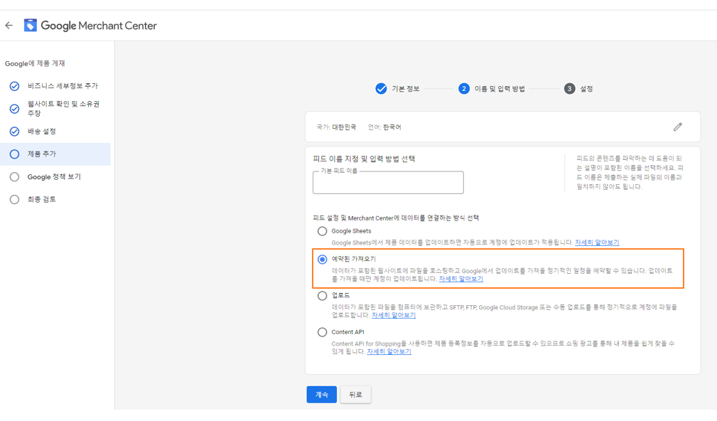8. 상품에 대한 설정을 진행하며 데이터 연결 방식은 예약된 가져오기로 설정합니다.