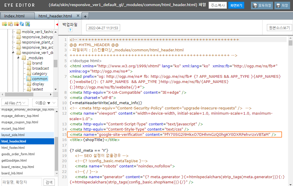 5. 복사한 메타태그를 관리자 페이지 [디자인] > [HTML에디터] 또는 'FTP'를 통해