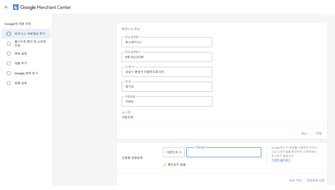 2. 비즈니스 정보 입력 및 국가 정보를 설정합니다.