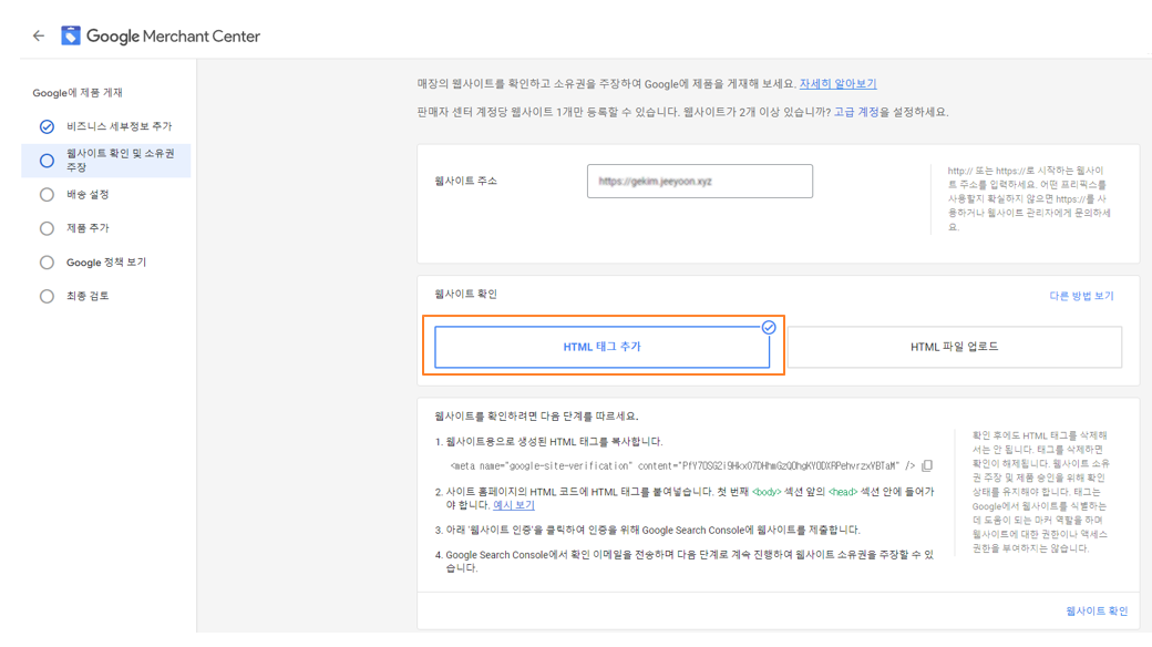 4. 웹사이트 주소 입력 후 'HTML 태그 추가'를 선택합니다.