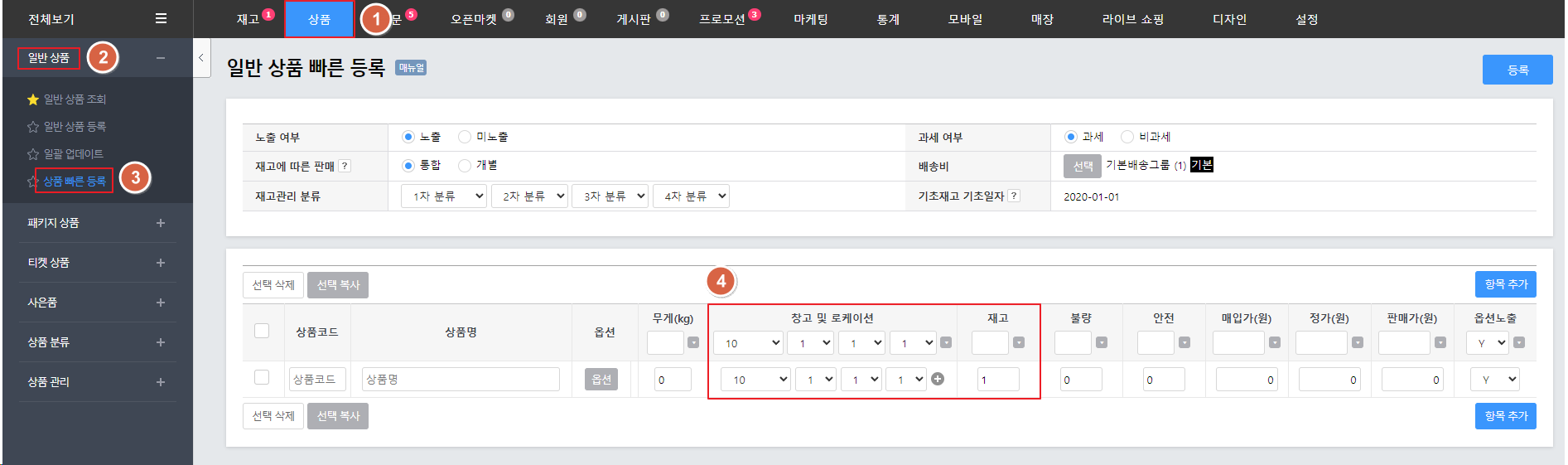 1. '상품 > 일반 상품 > 상품 빠른 등록'에서 상품을 일괄적으로 업로드 가능하며, 이 때 창고 및 로케이션을 선택하신 후 재고를 입력하시어 등록이 가능합니다.