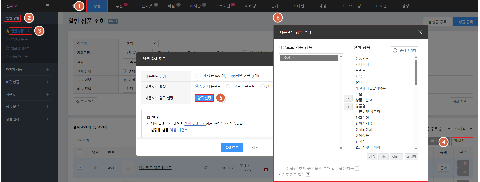 1. 엑셀 다운로드 및 업로드 양식의 경우 '상품 > 일반 상품 > 일반 상품 조회 > 엑셀 다운로드 > 다운로드 항목 설정'에서