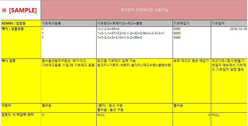 항목을 추가/제외 할 수 있습니다. 따라서 필수 항목 및 기초재고 항목을 추가해주신 이후 기존 상품 기준으로 엑셀을 다운로드 받으신 후 수정하시어 이용하시기 바랍니다.
