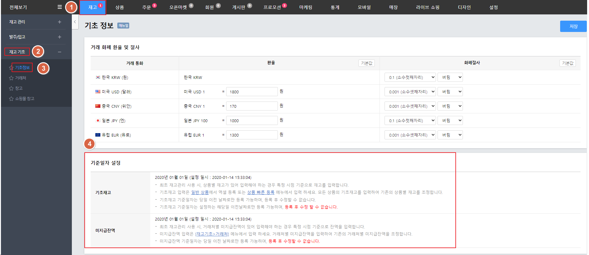 기준일자는 기초재고를 등록할 때 재고수불부에 기재되는 기준날짜입니다. 기초일자가 아닌 날짜에 상품의 재고를 등록한다 하더라도, 설정한 기준일자에 재고가 잡히게 됩니다