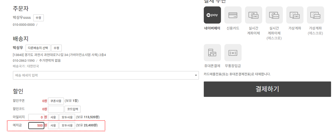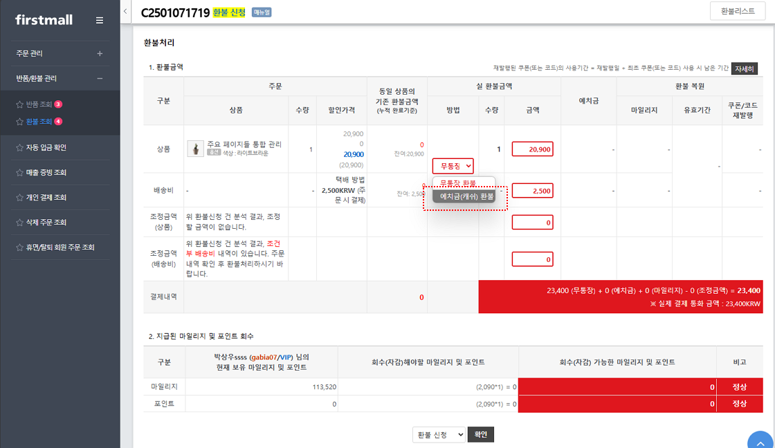 2. 예치금은 환불 시, 예치금으로 환불할 때 사용됩니다. 단, 무통장, 가상계좌, 실시간 계좌이체 주문인 경우에만 예치금 환불이 가능합니다.
