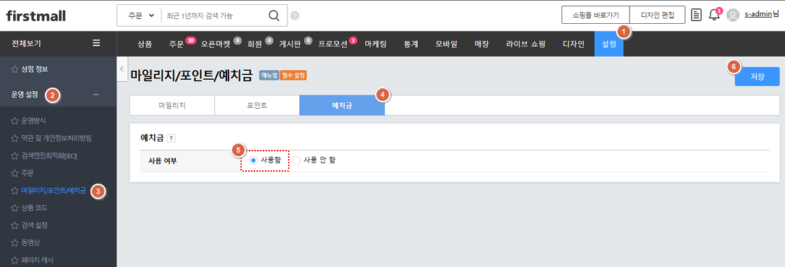 1. '설정 > 운영 설정 > 마일리지/포인트/예치금 > 예치금'에서 사용여부를 '사용함'으로 변경하여 주시면 됩니다.