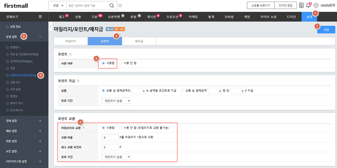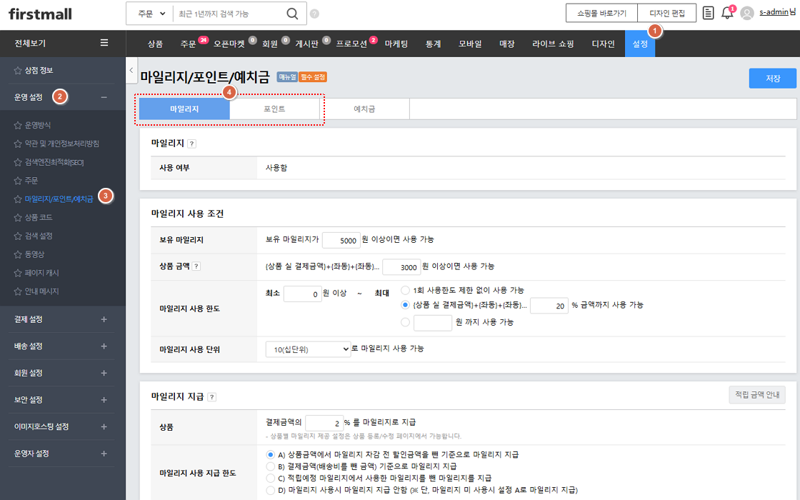 1. '설정 > 운영 설정 > 마일리지/포인트/예치금 > 포인트'으로 접속합니다.