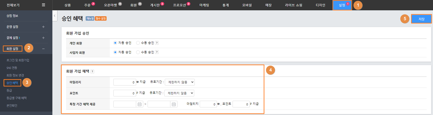 3) 회원 가입: '설정 > 회원 설정 > 승인 헤택 > 회원 가입 혜택'