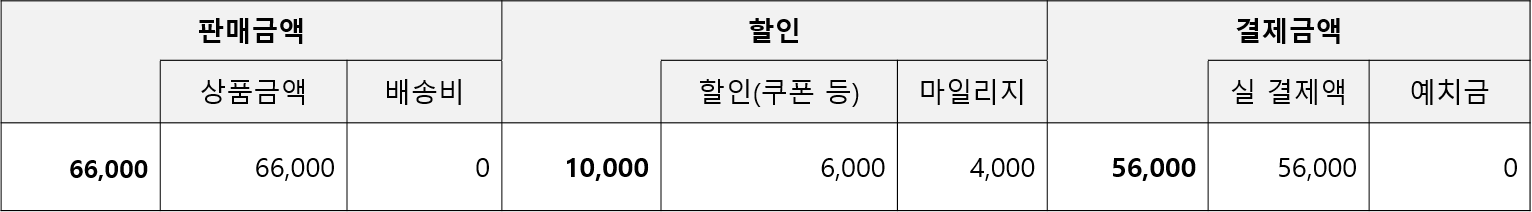 - 계산방식 : 상품 금액 – 할인 (마일리지를 제외한 할인)