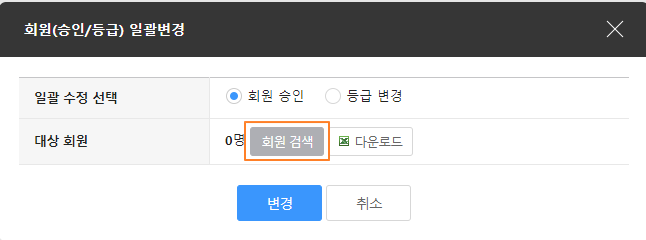 2. '회원(승인/등급) 일괄변경' 창에서 '회원검색'을 클릭합니다.