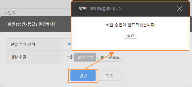 5. 안내 팝업 '확인' 후, '변경'을 클릭하면 승인처리 됩니다.