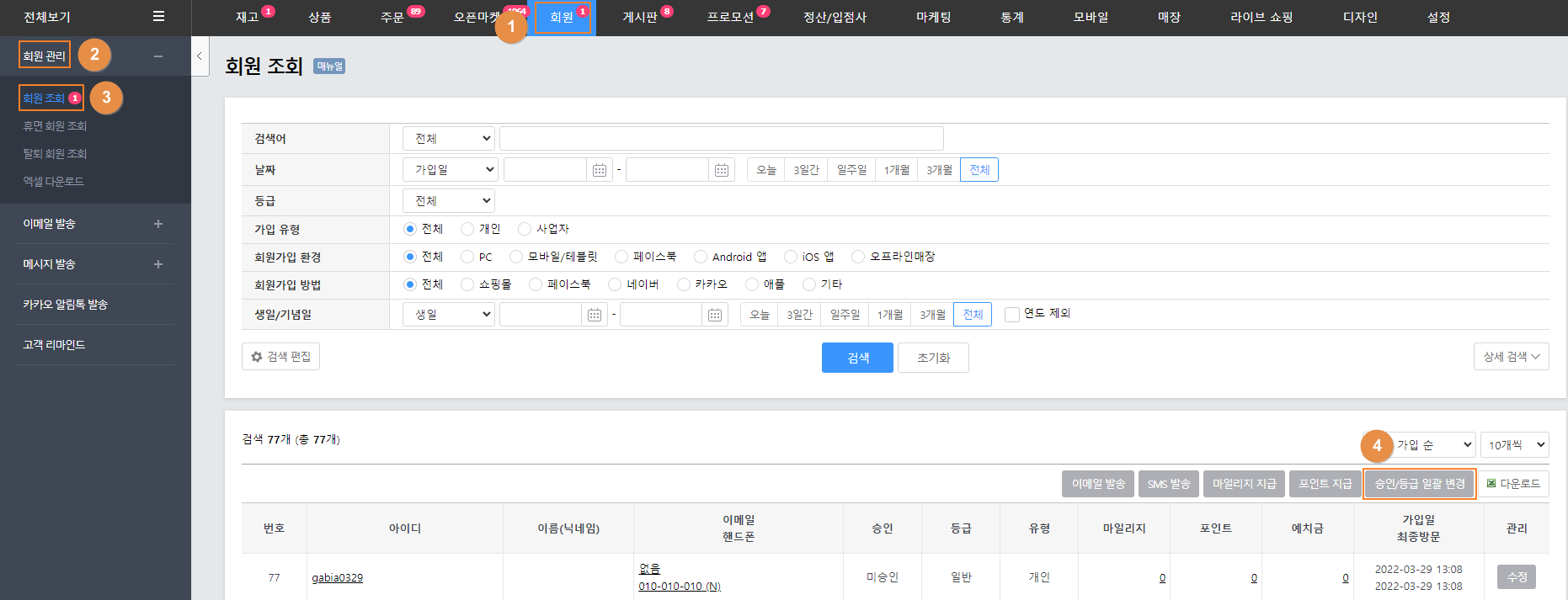 1. '회원 > 회원 관리 > 회원 조회'에서 '승인/등급 일괄변경'을 클릭합니다.