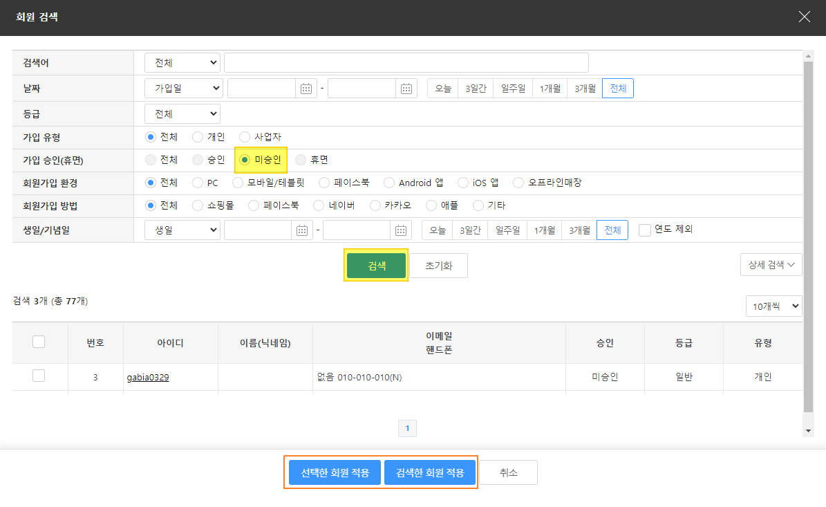 4. 기본 검색조건이 '미승인'으로 선택되어 검색되므로 '검색한 회원 적용' 클릭 시, 미승인 회원 전부 선택됩니다. 또는 선택한 회원만 승인하시고자 하신다면 리스트에서 승인하고자 하는 회원만 체크 후, '선택한 회원 적용'을 클릭합니다.
