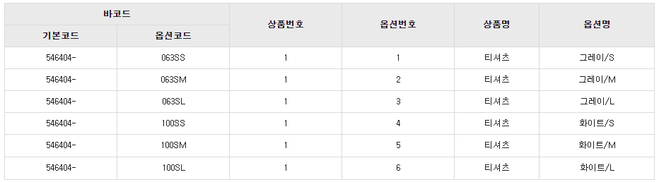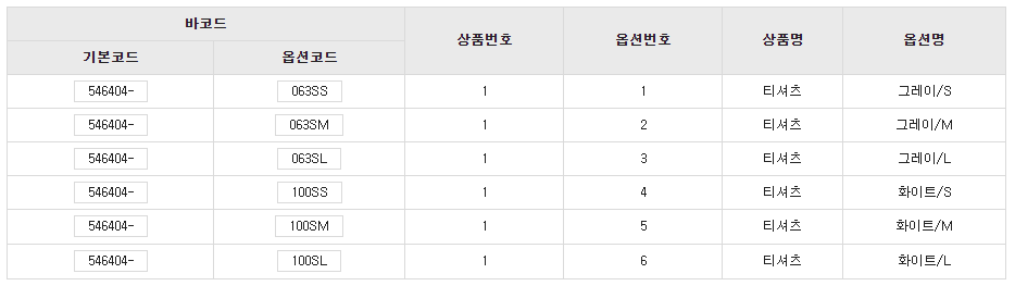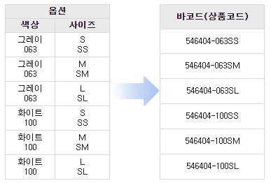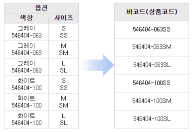 상품기본코드 입력란에 546404-와 같이 입력합니다.상품옵션코드 입력란에 아래와 같이 입력합니다. 최종 바코드는 기본코드와 옵션코드가 조합됩니다.