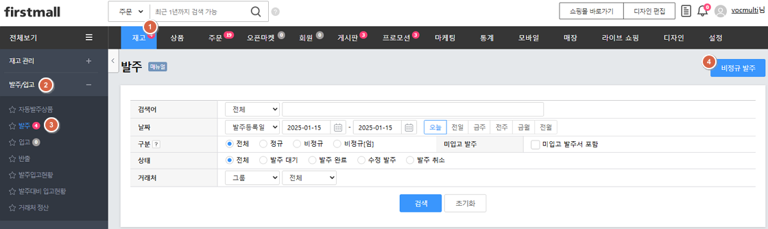 1. '재고 > 발주/입고 > 발주'에서 '비정규 발주'을 클릭하여 발주서를 등록할 수 있습니다.