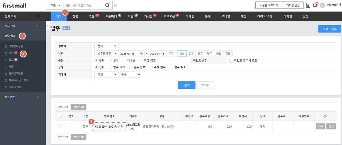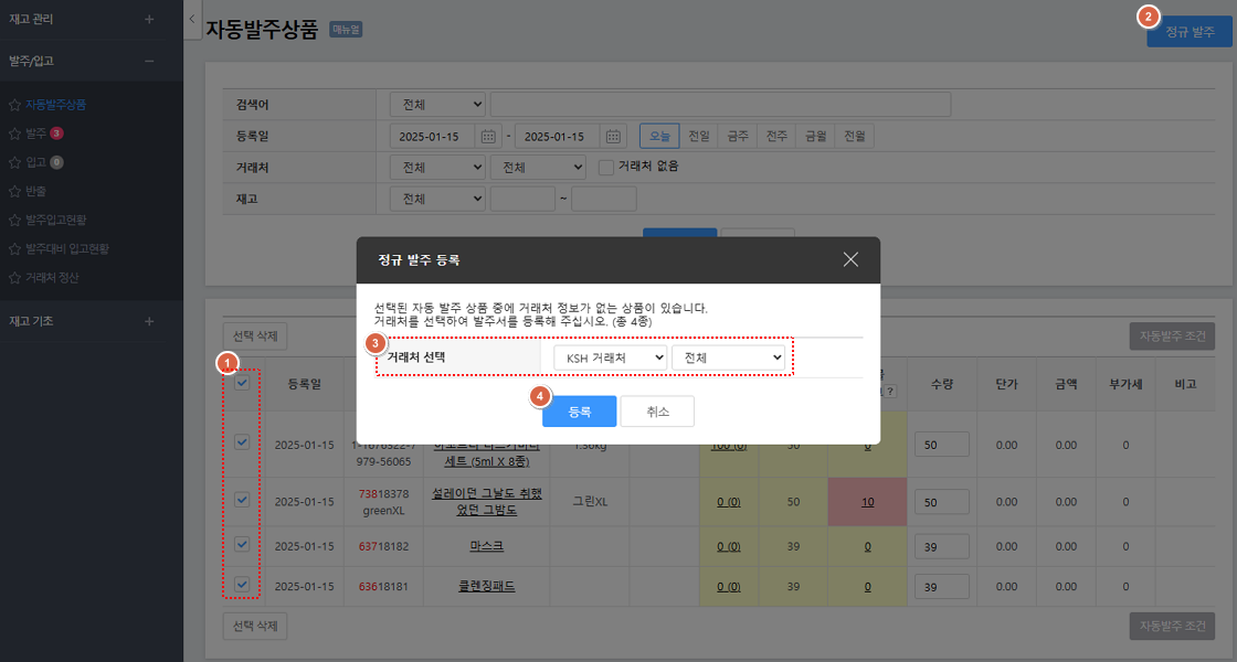3. 해당 일자 검색된 상품을 선택 한 후 정규발주를 클릭하여 발주서 등록을 합니다.