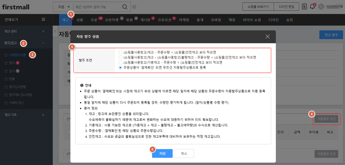 1. '재고 > 발주/입고 > 자동발주상품' 에서 '자동발주상품 조건'을 세팅합니다.