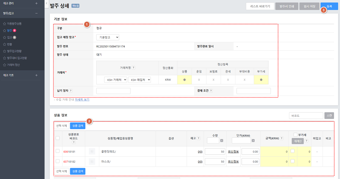 4. '재고 > 발주/입고 > 발주'에서 발주번호 클릭, 내용 확인 후 등록 버튼을 클릭합니다.