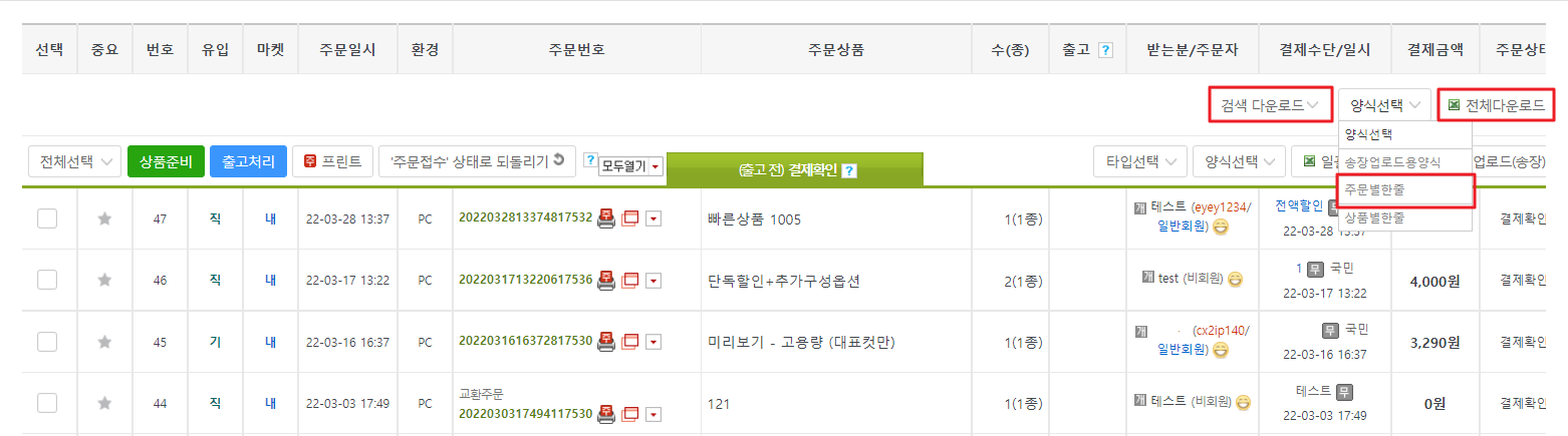 2) 타입선택 (검색 다운로드)/ 양식선택 (주문별한줄) 선택 후 엑셀파일로 다운로드합니다.