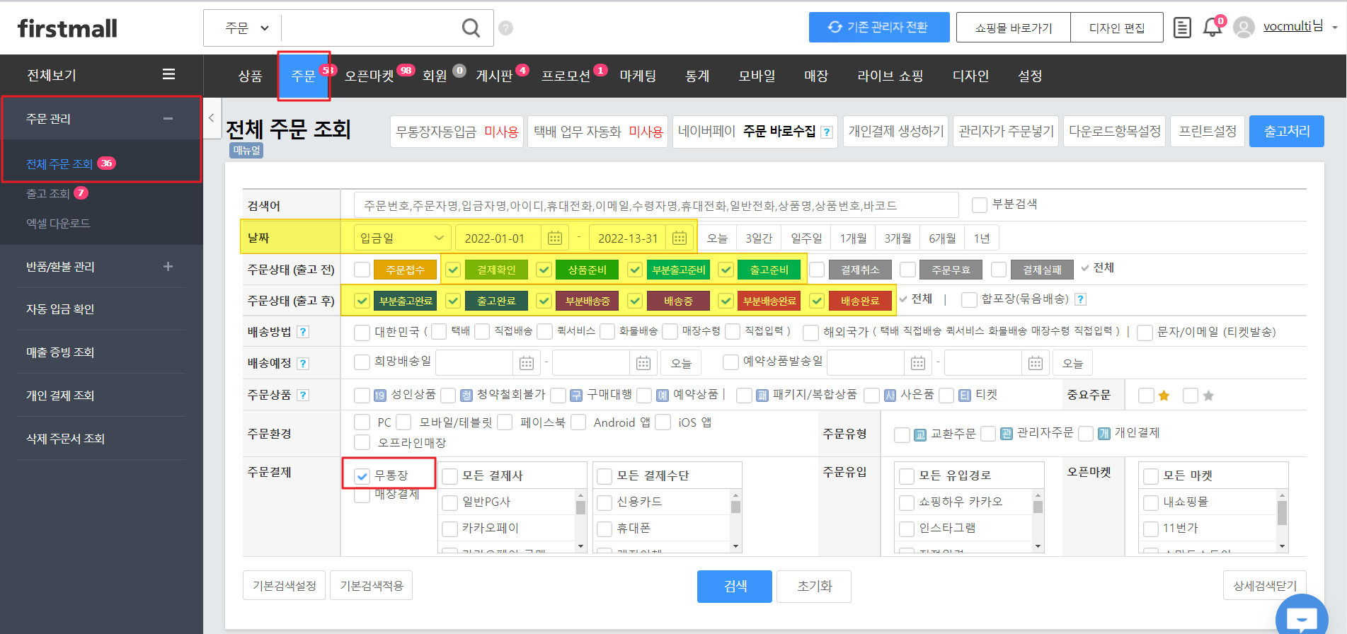 1) '주문 > 주문관리 > '전체 주문 조회'에서 입금일을 부가세신고 기간으로 선택, 결제방법을 '무통장 입금'으로 체크 후 조회합니다.