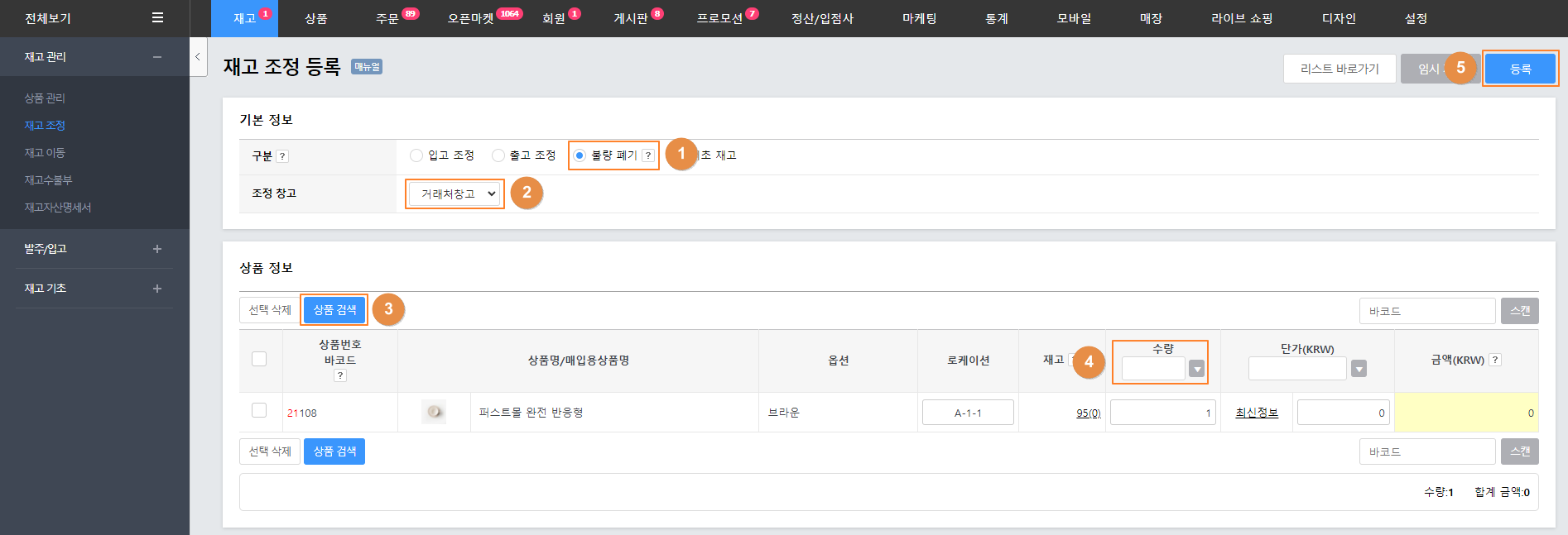 1. '불량 폐기'를 선택합니다.2. '조정 창고(불량재고가 있는 창고)'를 선택합니다3. '상품검색'을 통해 불량재고상품을 선택합니다.4. 불량폐기할 '수량', '단가'를 기재합니다.5. '조정 완료'를 클릭합니다.