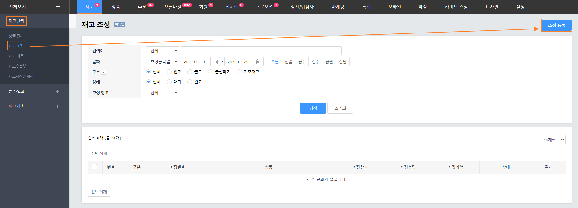'재고 > 재고 관리 > 재고 조정'에서 '조정 등록'을 클릭합니다.