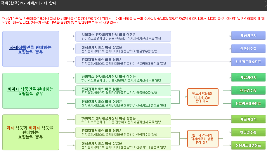 ※ 현금영수증 및 카드매출전표에서 과세와 비과세를 정확하게 처리하기 위해서는 아래 사항을 필독해 주시길 바랍니다. 통합전자결제 (KCP, LGU+, INICIS, 올앳, KSNET, KICC) 및 카카오페이, 페이코에 해당하는 내용입니다. (세금계산서는 PG를 통하지 않고 발행하므로 해당 사항 없음)