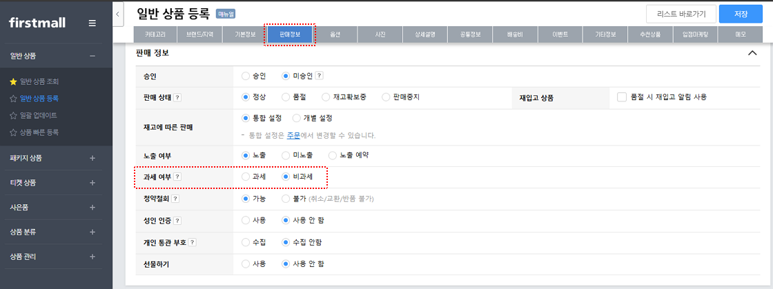 상품 등록(또는 수정) 시에, '판매 정보 > 과세 여부'에서 '비과세'를 선택하여 저장하시면 됩니다.