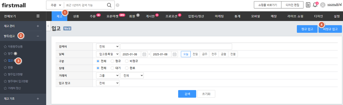 '재고 > 발주/입고 > 입고'에서 '비정규 입고'를 클릭하여 발주없이 입고를 진행할 수 있습니다.'비정규 입고'는 정상적인 발주과정 없이 상품을 창고로 입고하여야 하는 경우에 이용할 수 있습니다.
