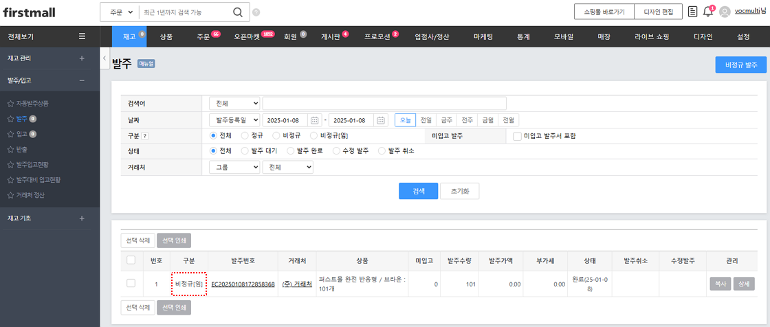 ※ '비정규 입고'를 진행할 경우에는 '재고 > 발주/입고 > 발주'에 '비정규[임]'으로 임시 발주서가 생성됩니다.