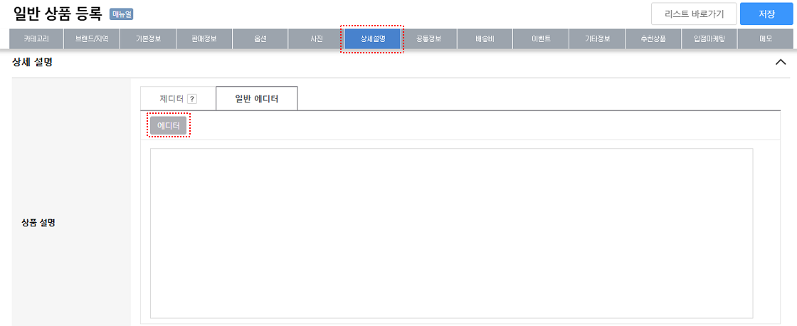 4. 상세 설명: 상품 상세페이지에 노출될 상품 상세설명을 '에디터'를 이용하여 등록할 수 있습니다.