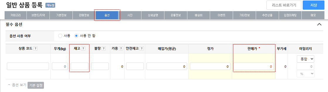 2. 재고와 판매가: 상품의 재고와 판매가를 입력합니다. 재고가 없는 경우 상품 상태를 '정상'으로 변경할 수 없습니다. ('재고와 상관 없이 판매'로 설정할 경우는 제외)