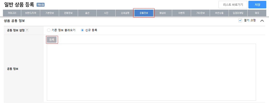 5. 공통정보: 상품 상세페이지에 노출될 '교환/반품/배송' 등의 정보를 입력할 수 있습니다.