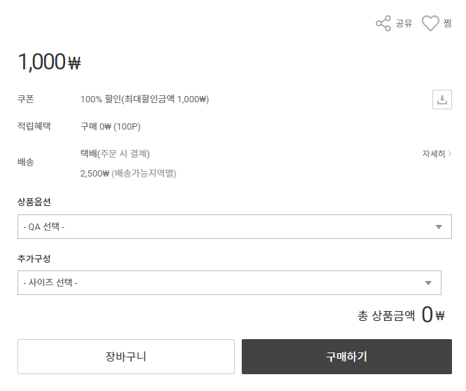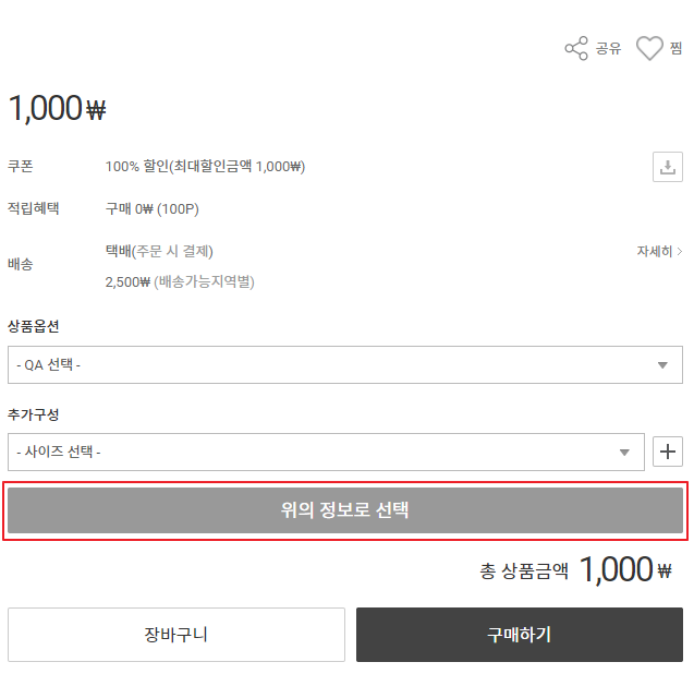 3. 상품 옵션을 확인해보시면 '위의 정보로 선택' 없이 구매가 가능한 것을 확인하실 수 있습니다.