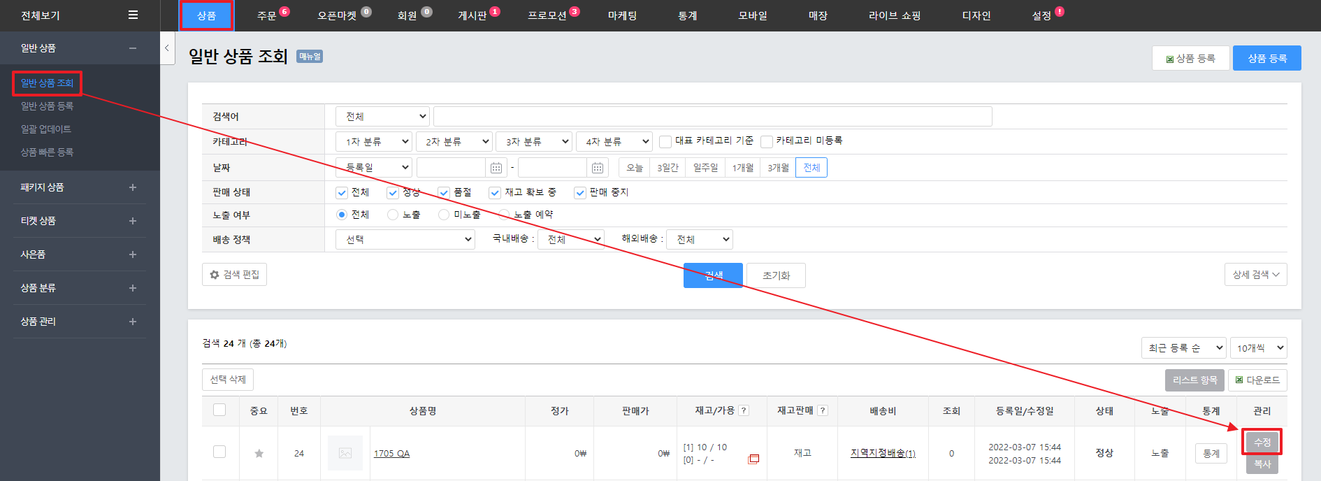 1. '상품 > 일반 상품 조회 > 상품 수정'을 클릭합니다.