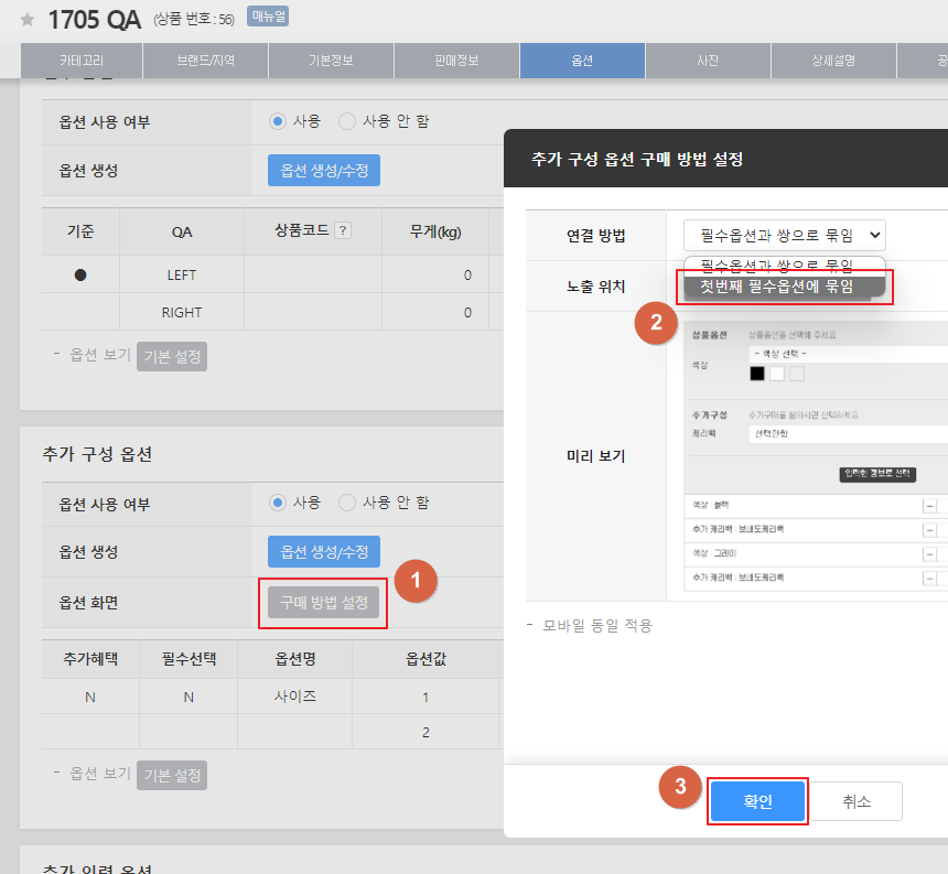 2. '추가 구성 옵션'의 옵션 화면에서 '구매 방법 설정' 을 클릭하여 노출 위치를 '첫번째 필수옵션에 묶임' 으로 변경해주신 후 확인을 클릭 해주세요.