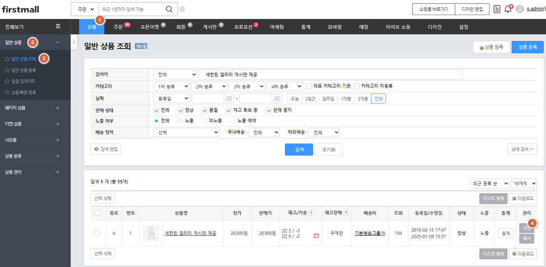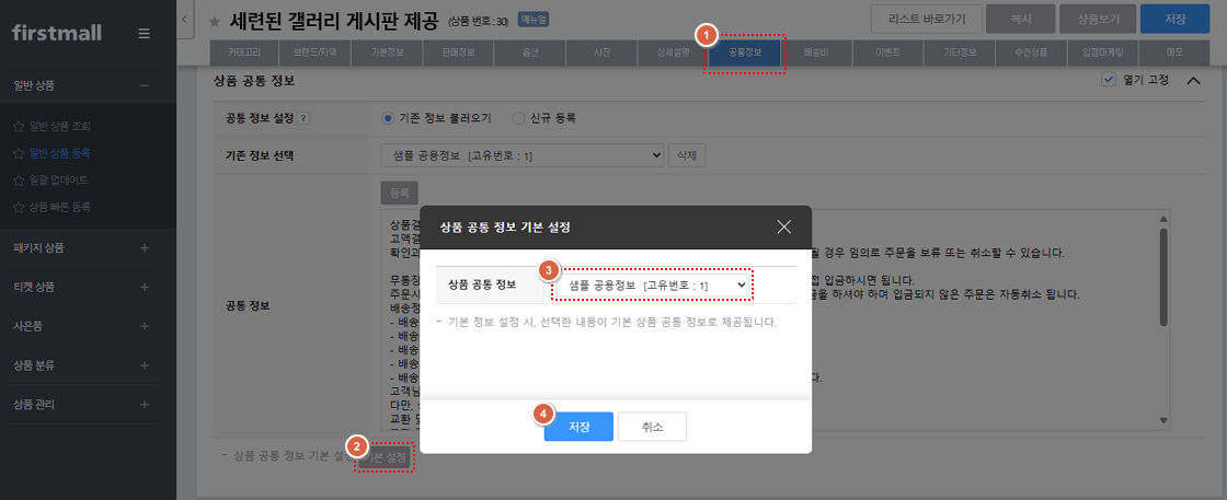 1. '상품 > 일반상품 > 일반상품조회'에서 상품 '수정'을 클릭합니다. 2. '공통정보'에서 '기본 설정'을 클릭한 후 설정할 수 있습니다.※ 설정이 완료되면 상품등록 시 공통정보에 내용이 자동으로 기입됩니다.