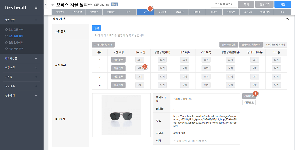 단, '개별등록'의 경우 이미지 업로드 시 '리사이징'이 되지 않습니다. PC에서 사이즈를 조정한 후 업로드하셔야 합니다.