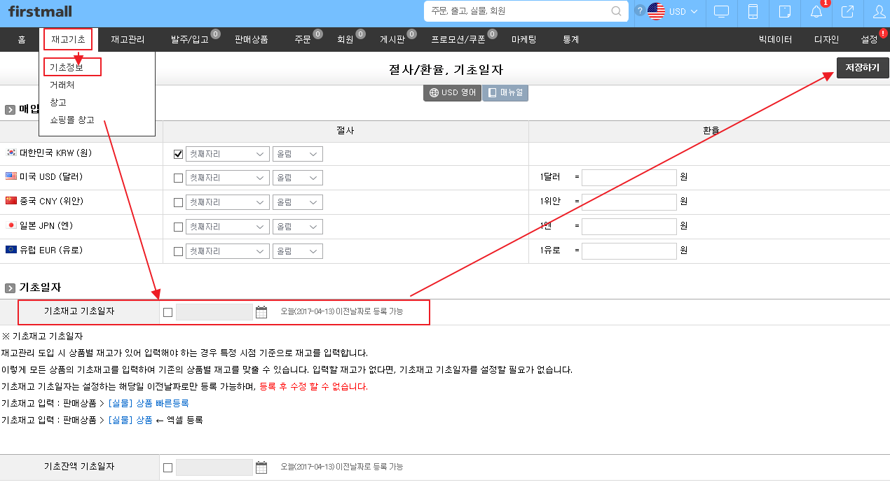 1. [재고기초]-[기초정보]에서 '기초일자'를 입력합니다. '기초일자'는 재고관리 도입 시 상품별 재고가 있어 입력해야 하는 경우 특정 시점 기준으로 재고를 입력합니다.