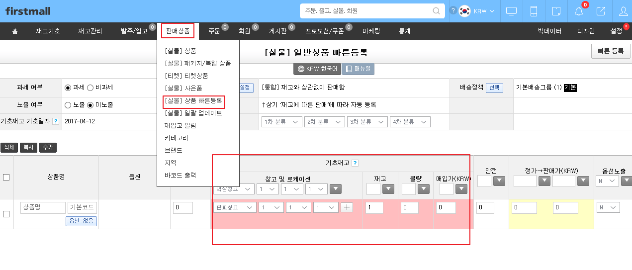 '상품 빠른 등록'을 이용하여 상품의 기초정보를 등록할 수 있습니다.단, 기존에 이미 등록되어 있는 상품은 기초재고를 입력할 수 없습니다.