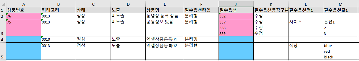 새로 등록하는 옵션(새로 입력하는 정보)의 필수옵션(필수옵션 번호)는 공란으로 비워둬야합니다.