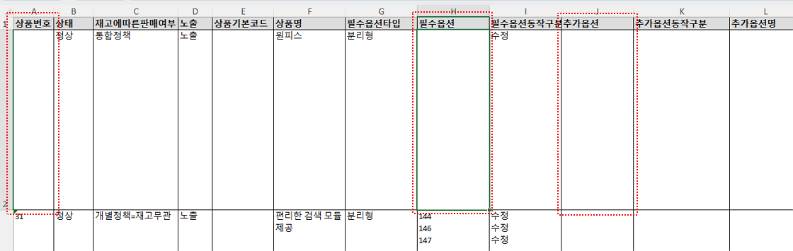3. 엑셀 파일을 열어서 필요한 데이터를 입력(또는 수정)하고 저장합니다. - 새로운 상품을 등록할 때는 '상품번호'는 입력하지 않아야 합니다. - 새로운 필수옵션을 등록할 때는 '필수옵션'는 입력하지 않아야 합니다. - 새로운 추가옵션을 등록할 때는 '추가옵션'는 입력하지 않아야 합니다. - 옵션이 있는 상품과 없는 상품을 등록 한 후 엑셀을 다운받아야 옵션을 입력하는 양식을 확인할 수 있으니 관리자 페이지에서 상품등록 후 엑셀을 다운받으시길 바랍니다.