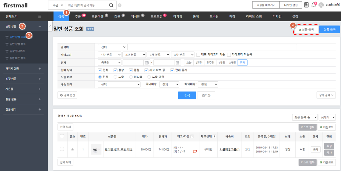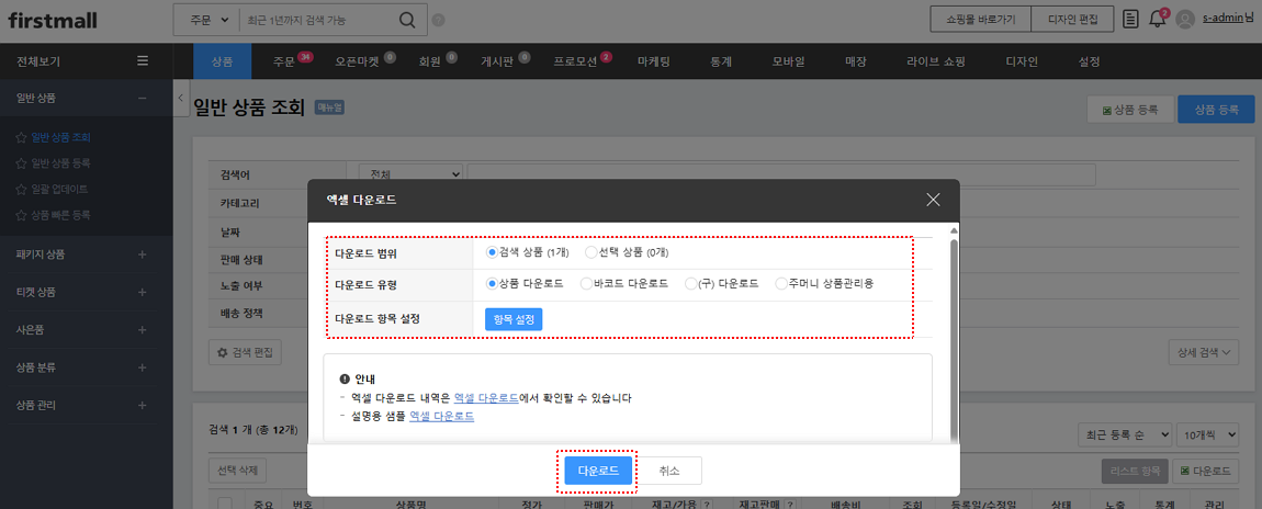 1. '상품 > 일반 상품 > 일반 상품 조회'에서 '다운로드'를 클릭합니다.