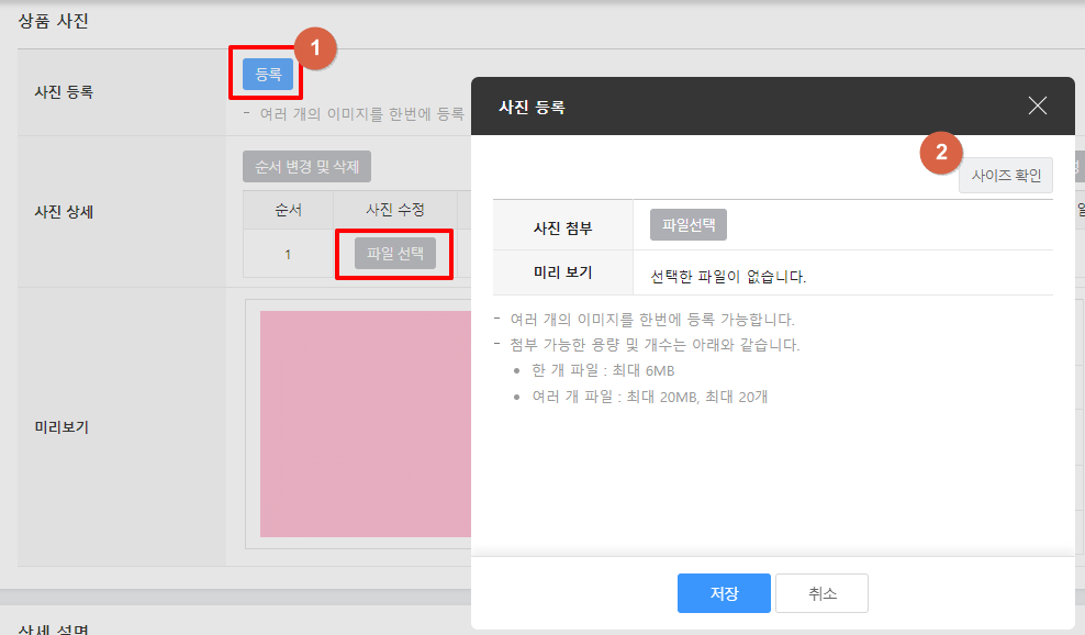 2. 사진 등록의 '등록'을 클릭, 사진 등록 창에서 사이즈 확인에서 설정을 변경하거나, 등록된 이미지가 있을 경우 해당 이미지의 '파일선택' 사이즈 확인에서 설정할 수 있습니다.
